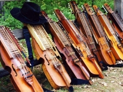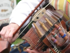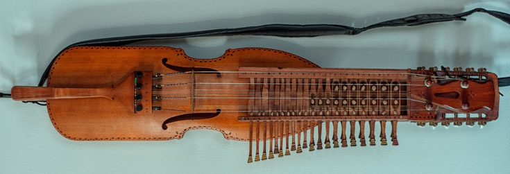 Nyckelharpa is a Swedish word that roughly translates to key fiddle. The modern nyckelharpa is a chromatic instrument with 16 strings: three melody strings, one drone string and twelve resonant strings. Those twelve strings lie underneath the melody strings and vibrate sympathetically, giving the instrument a robust tone. A tangent attached to each key touches a string when the key is pushed, effectively “stopping” or fretting it to make a particular note. Players use a short bow with the right hand and push on the keys with the left